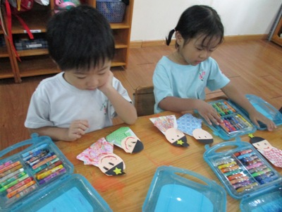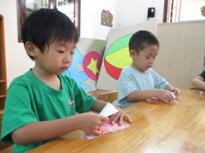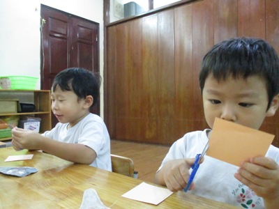 「さ~さ~の~は♪さ~らさら~」と、元気に歌う声が広がっています。 もうじき7月の行事 すずらん組(年中)でも、 すずらん組は、壁飾りを作りました 織姫と彦星の服は、千代紙で折っていきました。 少し難しかった様ですが、丁寧にゆっくりと折ると、 「1つできたらもうわかったー!!」と言って、 次には自信をもって折る姿もありました できるようになって、嬉しい表情が輝いています 顔は、事前に丸を描いてあった画用紙をはさみで切っていきました はさみの使い方も上手になり、真剣な表情がかっこいいですね いつもは、賑やかで元気いっぱいのクラスですが、、、 このときは、、、しーん、、、 「なんか静かだね」と、子ども達が言うほどです 可愛らしい表情はクレヨンで描きます。みんな優しい顔をしていますね 台紙の黒の画用紙も事前に丸を描いてあるところを切って、 そこに、、、 夏野菜の『オクラ』を、野菜スタンプしました。 子ども達には、 「これは、大事な食べるものです。でも、今日はこれでお星様を作っていきます。 大事な食べ物だけど、こうやって使うことにも感謝しようね」 と、話しをしました。 「なんだか、チクチクする。」「こっちは硬いのに(皮)、ここは(中身)ふわふわ!」 と、オクラのスタンプですが、オクラの触感も感じることができました 今度、いろんな野菜を触ってみようね のりで貼って完成です みんなの素敵な作品ができ曲がりました 七夕会では、各クラスで出し物をします すずらん組も発表の活動を取り組んだり、「ちょっと難しいけどやってみよう」と言う、 チャレンジする気持ちも育っています また、子ども達の様子をお伝えしますので、楽しみに待っていてください #082 ベトナム・ハノイの日系幼稚園 さくらHoaAnhDao幼稚園ホームページ |