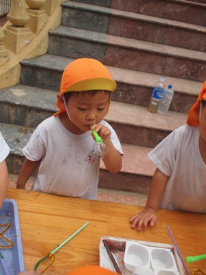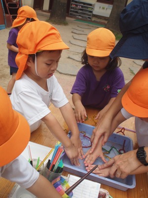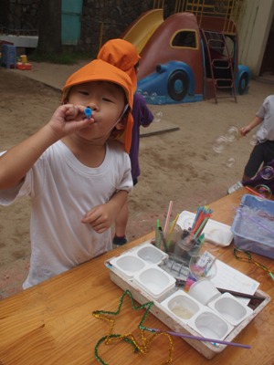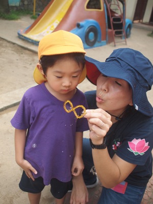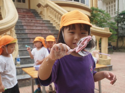 すずらん組の子ども達と、手作りしゃぼん液でしゃぼん玉あそびを楽しみました。 ストローに『トントントン』と、液をつけて、思いっきりふー あれ そうです 先生と一緒に「せーの やっていくうちに少しずつ上手に作れるようになってきました。 しゃぼん玉を楽しんだ後は、液に絵の具を混ぜ画用紙にふいてみると、、、 しゃぼん玉のはじける瞬間の跡がのこり、なんとも幻想的 模様が出来ました。 こけし ベトナム・ハノイの日系幼稚園 さくらHoaAnhDao幼稚園ホームページ |