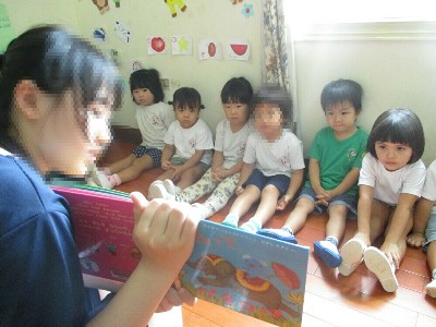 はじめは緊張して固まるこどもたちですが。。 お兄さんお姉さんの用意してくれた動物まねっこリレーでは うさぎになってぴょんぴょんと跳ねたり、 ライオンになってガオー!!と言ったり上手に真似をして楽しんでいました。 いつも読んでいる「だるまさんがころんだ」や「おふとんかけたら」などを 読んでもらってノリノリな子どもたちでした♪ 最後にはロジャーちゃんというお名前の大きな手作りのお馬さんを持ってきてくれました!! ロジャーちゃん大人も乗ることのできる丈夫さなんです 2人ずつ乗って教室をお散歩しました(^^) たのしくって笑顔の溢れるこどもたちでした♪ 中学生のお兄さんお姉さんありがとうございました! <なのはな組> なのはな組には、お兄さんお姉さんが2人ずつ遊びに来てくれました。 緊張ぎみの子ども達に、「今日はこんなことをするよ。」と優しく語り掛けてくれました。 遊びをたくさん考えてきてくれたお兄さんお姉さん。 お魚釣りゲームに、折り紙に、お絵かきに、、、 自然と子ども達から笑顔がこぼれます。 ふうせんバレーも楽しかったようでおおはしゃぎ。 お兄さんお姉さんが1冊ずつ選んできてくれた絵本の読み聞かせも しっかりと耳を傾けて聴いていました。 「お兄さんお姉さんはもう帰る時間だよ~」と保育者が伝えると 「まだ遊びたい~!!」 と別れを惜しんでいる姿もありました。 たくさん遊んでくれてありがとう!と最後は、バイバイタッチをしてお別れをしました。 とっても楽しかったね <すずらん組> すずらん組に来てくれたのは、3人のお兄さん。 子ども達のために、 手作りの輪投げゲームを作ってきてくれました。 『としょかんライオン』「ともだちひきとりや』「こんとあき』の三冊の絵本の、 読み聞かせも一生懸命してくれました。 ドロケイやふれあい遊びも、全力でやってくれたお兄さん。 ダイナミックな遊び方に、すずらん組さんは、大喜びで ホールには笑顔と笑い声が響いていました。