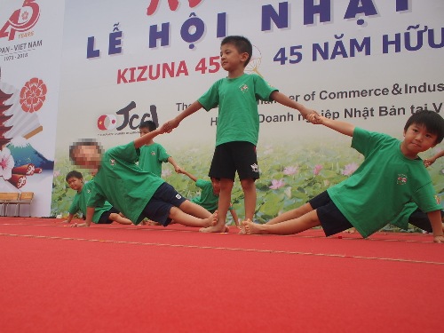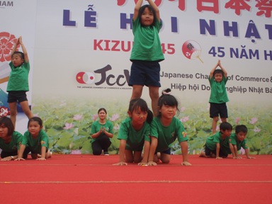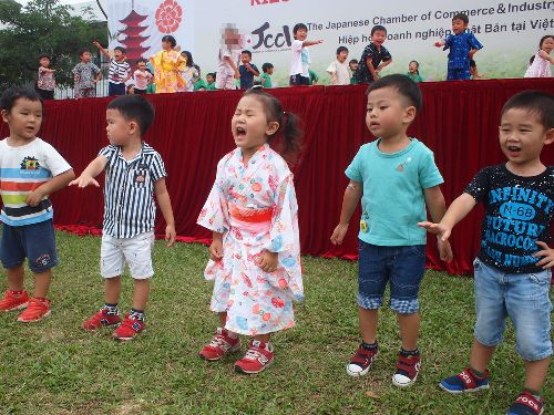子どもたちは、楽しみにしていた『ハノイ日本祭り』 さくら組(年長)は、幼稚園の運動会記念Tシャツの緑がとても目立ち、 すずらん組(年中)、なのはな組(年少)は、 お祭り仕様のはっぴを着ていたりして、とてもかわいい姿でした。 まずは、運動会でも発表した、 『 Rain』の曲に合わせた、組体操をさくら組が発表しました。 運動会とは違い、ちょっと高いところからの発表、 知らないお客さんがたくさんいる中での発表となりましたが、 子どもたちは、自信に溢れたたくましい姿を見せてくれました。 最後のピラミットは、 子ども達、全員で作り上げ心をひとつにした思いが溢れていました。 さくら組のみんな☆最後まで、感動をありがとう!! 最後は、3クラス合同で『ようこそ日本へ』のダンスを、 元気いっぱいに発表しました!! ステージの上からも、下からも、子どもたちの掛け声が響きわたり、 さくらっこの良さが、しっかり伝ったと思います!! 最後は、みんなでステージに上がりました。 みんなで楽しく、笑顔で踊ることができました! たくさんの方に見ていただき、子ども達もまた、いい経験になりました。 来年もぜひ!!出演できたら嬉しいですね!! ハノイ日本人商工会の皆様、実行委員やボランティアの方々、 今年も大変お世話になりました。 ありがとうございました。 (#082) ベトナム・ハノイの日系幼稚園 さくらHoaAnhDao幼稚園ホーページ |