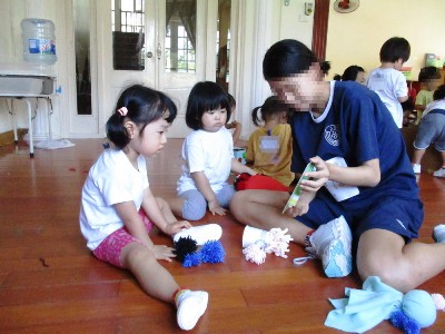いちご組、もも組(最年少クラス)の子ども達^^ プールや水遊びだけではなく、いろんな感触あそびもたのしんでいます! *洗濯あそび* タライを、わっせ!わっせと、運び!! 着ているTシャツを石鹸でゴシゴシと洗いました◎ いつもは、 「石鹸で遊ばないよー」なんて、お話しながら手を洗うのですが、、、 今回は、しっかり石鹸を手に付けてたのしみ、 あわあわになった手を、「すごーーい!!」と言って見せてくれました。 普段では、なかなかできない活動を、遊びの中でたのしみ、 子ども達のいい表情が見られました! *かんてんあそび* 前日に「明日は、かんてんであそぶよー!!」 「。。。???」 子ども達の中では、『かんてん』が何なのか分からず、ぽかーん、、、としていたので、 「おなべに粉を入れて、火をつけてぐるぐる混ぜて、冷蔵庫に入れたら、固まってるからね!」 と、伝えていたので、、、 当日、 「かんかんできた?」「はんぺんできた?」 「ん~!!!おしい!!!『かんてん』できてたよー」 と言って、おなべを持って外に遊びに行きました。 固まった『かんてん』を見て、 「つめたーーい!>0<」 「かたーい>0<」と言って、ゆっくり触っていました。 一人ひとりのお皿に入れて、 手でつぶしてみたり、おもちゃの包丁で、トントンと切って遊んでいました。 スプーンですくって、お友達と食べるまねっこをしたり、 おなべでぐるぐる混ぜてみたり、 子ども達の世界が広がって、いろんな遊びを展開していました。 感触遊びが苦手なお友達も、いつの間にかかんてんを持って 夢中になって遊ぶ姿も見られました◎ *なっとう~なっとう~ねーばねば♪* 最近、子ども達は『納豆』の手遊びが好きで、よくやっています。 『おしくらまんじゅう』の絵本にも、納豆が登場するので、 絵本に合わせてよく歌っています◎ しかし、、 ハノイに住んでいると、なかなか『納豆』というものを見たことがないお友達も多いので、 みんなで本物の、『納豆』がどんなものなのか、見て、触って、においをかいでみました。 その前に、みんなで納豆の手遊びをしています。 最後のキメポーズをやるところです☆ 子ども達に、納豆ってなにいろー?と、聞いてみると、 「茶色!!」と答えてくれたお友達もいたのですが、 中には、、、 「ピンク!」「みどり!!」と、いろんな回答が聞こえました・・・ 正解は「茶色でしたー!!」と、本物を見ると、 「ちいさいねー!」「こつぶなっとう!!」と、すでに興味深々の姿があり、 納豆のにおいをクンクン。。。 「わっ!!」と言ったり、「何か変なにおいがする、、、」と、 子ども達から、素直なコメントが返ってきました。。 きっと、想像していたのものとは、違ったのかもしれませんね。 納豆を手に乗せて、触ってみました。 みんな興味深々で、身を乗り出してみています。 はやく!はやく!と、手を出して待っていたのですが、いざ手に乗せてもらうと、、 「・・・;」 固まってしまい、いつも賑やかなクラスでも、、「しーん」としてしまうほど。。。 嫌だったようで、手から落とそうとするのですが、くっついて取る事ができなくて、 「なんか、、なんか」と、言葉が出ない姿もあり、 触るのは、苦手だったようです。 急いで手を洗いに行っていました^^; それでも、「なっとうねばねばだったよねー」「手についたよね」と言って、 経験した事がなかったことだったので、話も止まりませんでした。 子ども達は、まだまだ知らない事がたくさんあります。 色んな経験をして、これはたのしい!!もう一回やりたい。 という気持ちがもてる、環境作りを大切にしていきたいと思います。 さぁー!! 次は、どんなことが待っているかな^^ (#082) ベトナム・ハノイの日系幼稚園 さくらHoaAnhDao幼稚園ホームページ |