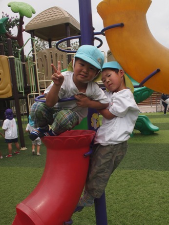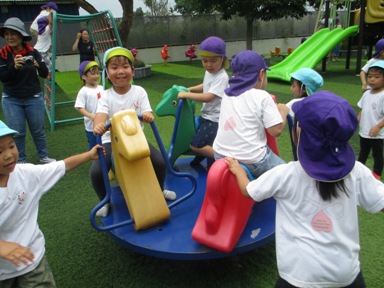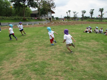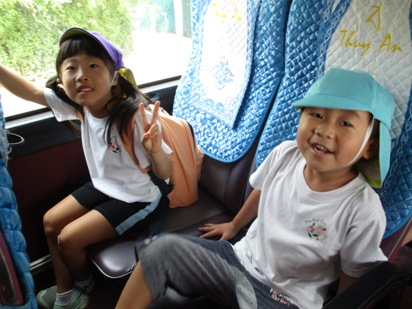 遠足日和の中、すずらん組(年中)さくら組(年長) [nang song hong 観光村]へ遠足に行ってきました◎ 大きなバスの乗るのも久しぶりだったので、 嬉しさが伝わるほど、盛り上がって出発できました! 今回特別ゲストに、、 バスガールとマジョリーナが遊びに来てくれて、 バスの中でも楽しいゲームやクイズをして大盛り上がりでした。 到着すると。。。「あっ!だれかがいるー!!」 子ども達を出迎えてくれたのは、笑顔が素敵な『タムさん』です^^ みんなの事を待ってくれていて、いっしょに写真を撮ったり、握手してもらいました。 「わぁー幼稚園よりひろーい!!」と言って、わくわくいっぱいでした! トンボやちょうちょが、子ども達の上を飛んでいたり、 お花もきれいに咲いていたり、大型遊具もあって、 子ども達の笑顔が溢れていました。 ☆ゲーム大会☆(あか、黄ピンク、みどりグループに分かれて行いました) 広い芝生の上でのびのびと元気いっぱい遊びました。 グループ色のカードを隠します。 探すカードは他の色のカードです。 どこに隠そうか相談する姿は、真剣そのものです 「お~い」「あったよ~」と 見つけた喜びとそれを伝えたいという思いが伝わってきますね なんと どんな絵ができるかな? 真剣な眼差しで解いているところです。 みんなで見つけたカードがひとつの絵になり、 子ども達も嬉しそうでした その後は、幼稚園でも大ブームのしっぽとりをしました。 いつものしっぽとりではなく、、、 グループ対抗戦の、、 『バトルだ!!しっぽとり』 今日は、広々と走れるので 子ども達も思いっきり走ったり、友達と協力したりして いつも以上に白熱する姿が見られました。 すずらん組のお友だちを応援する姿や、 取られてしまっても「大丈夫だよー」と、優しく声をかける姿もあったりして、 みんなで楽しむことができました。 遊ぶだけではなく、 『おやつタイム』 も、楽しみのひとつ!みんなで芝生にシートを広げて 自分の大好きなおやつや、自分で選んで持ってきたおやつ、 遠足の特別なおやつを喜んで食べていました! 最後に大型遊具でもうひとあそび!! 走って遊ぶ事も好きですが、 こうやってお友だちといっしょにたのしむ遊具も、子ども達大好きですよね! 「これもあそびたーい!」「あっちでもあそびたーい」 といって、お友達を誘ったりして、しっかり遊んで帰る事ができました! キメポーズでハイチーズ☆ 帰りのバスでは、お疲れかと思ったのですが、、 \バスガール/\バスガール/ というリクエストが出て、バスガールが登場してくれました☆ <何が入っているでしょうクイズ>をいっしょにやりました。 帰りのバスの中でも、元気いっぱいの声が響いていました! (※ちょっと写っているのがバスガールです^^:) 遠足後、すずらんぐみとさくらぐみの仲が深まり、一緒に遊ぶ姿が見られています。 これからもクラスのお友達だけでなく、仲間と共に楽しい経験をたくさんして、 絆を深めていけたらと思います。 (おはな)(#082) ベトナム・ハノイの日系幼稚園 さくらHoaAnhDao幼稚園ホームページ |