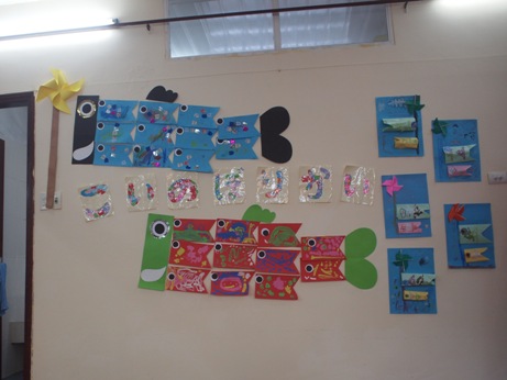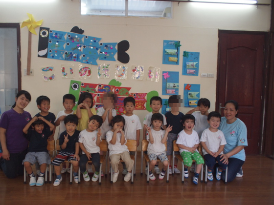 さくら組(年長)になると、『こいのぼり』の由来もよく知っていて、 「男の子お祝い!」「女の子は3月だよね」 と話してくれました。 一年に一回の日本の文化ですが、毎年大事にしていく大切さを感じました。 さくら組も、ひとりひとりのこいのぼりの作品を作りました。 全員で、椅子に座って活動を始め、真剣に取り組む気持ちが 背中から伝わってきますね。。 こいのぼりの体の色紙を、立体に丸めながら作っていきます。 「大きくまるーく作りたいけど、どうやってやるの?」 と、職員に聞いてくる姿もありました。 こんなのが作りたい!と言う気持ち、発想がしっかりとあり、 さすがだなーと思いました。 こいのぼりの模様は、折り紙の切り絵です。 女の子は、折り紙選びのも時間がかかっています^^; 「これもかわいいー」「みて、これちいさなお花があるよ」 ひとつ選ぶのも、大事なことです。 男の子の中でも、いろんな折り紙がある中で、 全部同じ折り紙を選んでいく姿もあったり、個性が色んなところで見られますよね。 小さくきっていくのは、ちょっと難しかったかな。。 それでも、諦めずに、ゆっくり丁寧に活動する姿が見られています。 難しいところだったからこそ、できたときには、 子ども達も嬉しくって「ほらーできたー^0^」と、笑みを浮かべています◎ お友達と、見せ合いながら、 同じものがひとつとない形が出来上がりました!! 毎月1回は、折り紙の活動もしています。 4月はこいのぼりにつける『風車』を作りました。 しっかり指でアイロン(折り目)をつけて、きれいに作っていきました。 集中しすぎて、口が開いてしまうお友達もいました。 お友達に教えてあげたり、 集団で活動するからこそ!! できたー!の気持ちと、教えてくれてありがとう。の嬉しかった気持ちが、 育っていくのだともいます。 さぁー最後に、今まで作ってきた作品を、画用紙に張っていきます。 周りには、クレヨンで絵を描いたり、 切り紙のあまりを、画用紙に張ったりして、 平面作品ですが、立体的のこいのぼりが出来上がりました。 さくら組になって、初めての大きな作品が出来上がり、 こんなにできる事が増えていたり、 お友達同士で、教えあったり、考えて作り出したり、 一人一人の個性が、こうやって育っていくのがわかりました。 これから、もっとたくさんの作品を作り出していくと思います!! どんな世界が広がっていくのか、たのしみいっぱいですね^^ (#082) ベトナム・ハノイの日系幼稚園 さくらHoaAnhDao幼稚園ホームページ |