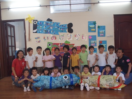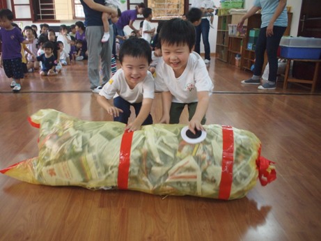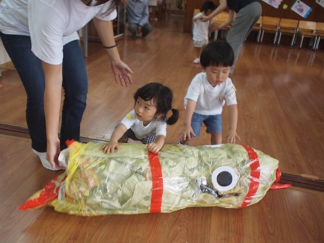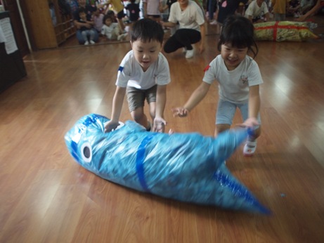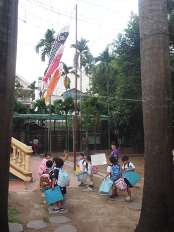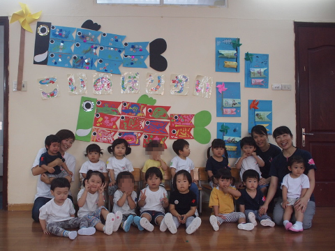 5月のお楽しみ会は、^^こいのぼり会^^です。 各クラスの素敵なこいのぼりの製作がホールに飾られて、 子ども達も、「あっ!ぼくのがあったよ」と言って、みんなで見ることができました。 なのはな組(年少) 1人1人が作ったこいのぼりをつなげて 大きなこいのぼりが完成。 『こいのぼりかい』の文字は、さくら組さんが、ちぎり貼りをしてくれました。 さくら組(年長)個性溢れるこいのぼりたち とすずらん組(年中)しっぽを触ると、ゆらゆらとゆれるかわいいこいのぼり。 いちご、もも組(最年少) 色鮮やかなこいのぼりが泳いでいます。 どの作品も本当にかわいくて、それぞれの成長も感じることができました。 こいのぼりの由来は、映像でお知らせしました。 ・こいのぼりはどこからきたのか ・こいのぼりがなぜ男の子の日で、お祝いする日なのか 子ども達もよく見て、こいのぼりのことを知ることができたと思います。 日本の祝日でもあり、大事な行事の一つなので、 大人になっても覚えていてほしいですね。 ぜひ、おうちでも聞いてきてください^^ ちなみに、由来を説明しているのは『鯉ガール』でした! 続いては、みんなで『こいのぼりころがしゲーム』スタートです!!! 2つのグループに分かれて、こいのぼりに新聞紙を入れて、 大きく膨らませます◎ みんなで、ぎゅうぎゅうと入れていき、小さなお友達もできるように、 お姉ちゃん達が渡してあげたりする姿も見られました。 コロコロゲームスタート◎ みんなで詰めた大きなこいのぼりが転がっていきます! わぁぁー!!どこにころがっていくのでしょかー おっとっと!! 大きなこいのぼり、まっすぐに転がしていくのは、少し難しかった様ですが… お友達と一緒にすると楽しくて、 みんないい笑顔で参加することができました◎ 小さなお友達の一生懸命さは、やっぱりかわいいですね! 最後は、各クラスの集合写真^^ かわいいお顔ではいちーーず☆ カメラの側では、お友達が面白い顔をして、 みんなを笑わせてくれていました!! いちご、もも組 ちいさなお友達は、先生のお膝に座っていますね! なのはな組 しっかり、自分たちで座って、面白い顔のまねっこをしていますね! すずらん組 かわいいポーズに、かっこいいポーズ!ポーズが決まってますね◎ さくら組 お兄さん、お姉さんらしい表情が見られていますね!! コロコロゲームのこいのぼりと一緒に、ハイチーズ☆ しっかり遊んだ後は、、、お楽しみランチ!! 全園児集まって、元気いっぱいの「いただきます」が聞こえました。 美味しい給食を、みんなで食べるこの時間も、みんな大好きです。 もりもりしっかり食べて、大きくなってねー さぁー!! 暑い暑い、、夏のハノイがやってきます。 6月からはプール活動が始まりますので、 来月のお楽しみ会は、『プールびらき』です** 子どもたちも、プールを楽しみにしています。 暑さに負けずに過ごしていきたいです^^ (#082) ベトナム・ハノイの日系幼稚園 さくらHoaAnhDao幼稚園ホームページ |