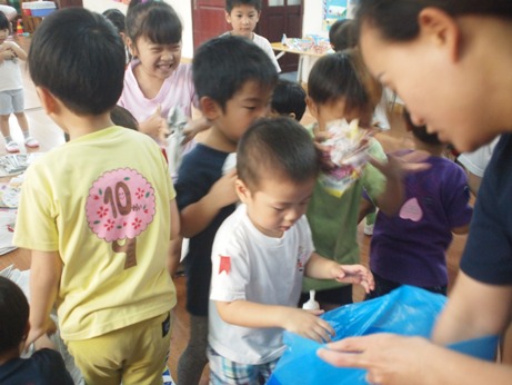 いちご・もも・なのはな組のみんなで お散歩に行ってきました! さあ、お友達と手をつないで~ 『しゅっぱつしんこう、えいえいおーー!』てくてく歩いていくと、近所のおじさんに会いました。 みんなでごあいさつしましょう! 『しんちゃお!!』おじさんも、嬉しそうに笑い返してくれました。手をしっかりつないでくれています。 なんだか、頼もしいですね。 『あそこに、フルーツがおちてるよ!!』 子どもが指をさした先には・・・ ジャックフルーツだ!!でも、これはまだ小さいジャックフルーツの実です。子どもたちは興味津々。 なんだか、トゲのようなものがありますよ。 自然と子どもたちの手が伸びます。 さあ、幼稚園に帰ってきました。 ジャックフルーツの中が気になります。 ちょっと、切ってみましょう! なかなか硬いぞーーーー 切れましたーー! 中をのぞいて、子どもたちはこの表情。 『なんだか白いね。』 『くんくん、匂いはあんまりしないね。』 わわわ!!なんだか、白い牛乳のような液体が にじみ出てきました! さわってみると、なんだーーー!? くっついて指と指が離れないくらい糸をひくんです。 『くもの巣みたいだねー』と、 子どもたちも不思議そうに見ています。 ちょんっとつついてみたりなんだか楽しいです。 いろんなものを発見した、楽しいお散歩でした。 また、みんなでいこうね! (まんごーさん) ベトナム・ハノイの日系幼稚園 さくらHoaAnhDao幼稚園ホームページ |