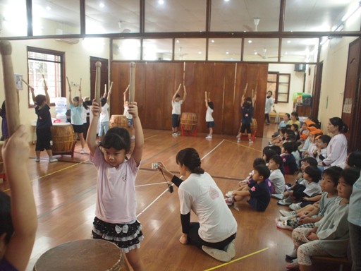 一年を通じて、大きい子も小さい子も一緒に活動する 異年齢での取り組みも大切にしています。 一年の集大成というべき生活発表会。 この生活発表会でも異年齢活動の取り組みの姿を見て頂けます♪ 今年も始まりました、発表会に向けての異年齢活動!! 2グループに分かれて行っています。今年はどんな活動でしょうか?ちょっとみてみましょう♪ ~はらぺこあおむしグループ~ 子ども達もよく知っている、『はらぺこあおむし』のお話を、 ペープサートで発表します。 『はならぺこあおむし』の歌も、聴いたことあるお友達も多く、 巨大絵本を見ながら、みんなで歌いました。 そして、 子ども達とパネル作りです。 大きな紙にまずは、 あおむしが食べている、りんごや・なし・オレンジなど、 みんなで描いて色塗って作り上げていきました。 絵を描きながら 「わたしりんごすきだから、りんごつくるー」 「いっぱい食べすぎだよねー」 「オレンジってすっぱいよねー」 と言って、 子ども達同士で、すでに世界が作り上げられていて、 聞いていて、楽しく活動しているのがわかりました! 小さなお友達には、 お姉ちゃん、お兄ちゃんたちがお手伝いする姿が、 自然と見られていました。 こうやって、一年間異年齢で活動してきて、 子ども達の中で、育っている素敵なところだと実感します。 これから、どのような発表の取り組みをしていくのか、 たのしみにしていてください^^ ~はながさグループ~ 笠に花飾りをつけた花笠をもって「花笠音頭」の音にあわせて街をねりあるく 日本のお祭りをステージで発表します。 山形県で広く知られているお祭りです。 子どもたちと話をすると 「やまがたけんはしっているけどお祭りはきいたことない~」 みんなで曲を聴いて歌詞にはどんな意味が込められているのかを知りました。 みんなで踊ってみました! 「おもしろーい」と子どもたち。 踊りがすきな子どもたちばかりで、終える頃には曲に合わせて すこし踊れるようになっていました! 笠をもってまわるのがとてもじょうずだったので、 ひとりの年長さんにみんなの前で踊ってもらいました! 異年齢ということもあり、お兄さんお姉さんたちはちいさいお友達と手を繋いで 優しく連れて行く姿が多く見られました。これからの活動お楽しみに。 ベトナム・ハノイの日系幼稚園 さくらHoaAnhDao幼稚園ホームページ (LEGO #082ジャスミン) |