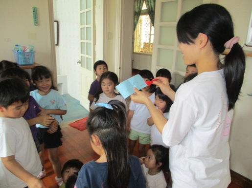 「おはようございます!」と元気いっぱいで登園してくる子どもたち。 みんなとっても楽しみにしていました! チケットを持って並びスタンプを押してもらいます。 今回はなのはなぐみさんも一緒に見ることに 「~番の席へどうぞ~!」 スタンプを押してもらうと番号の席へ座ります 「きょうはどんなおはなしかな~??」 「チケットの絵におばあさんがいる~!!」ワクワクしていました。 「ようこそさくらっこえいがかんにおこしくださいました」 かんちょうさんからのお話を聞きます 本日は、、、 ’’ うばすてやま ’’ ’’ いもほりちょうじゃ ’’ この2つのお話になっております こどもたちはじーっとよく見ていました いもほりちょうじゃのおはなしでは子どもたちから何度も笑い声が聞こえてきました さいごはみんなでにんげんっていいな うたを口ずさんでいました おたのしみのさくらっこえいがかいいでした (ジャスミン) ベトナム・ハノイの日系幼稚園 さくらHoaAnhDao幼稚園ホーページ |